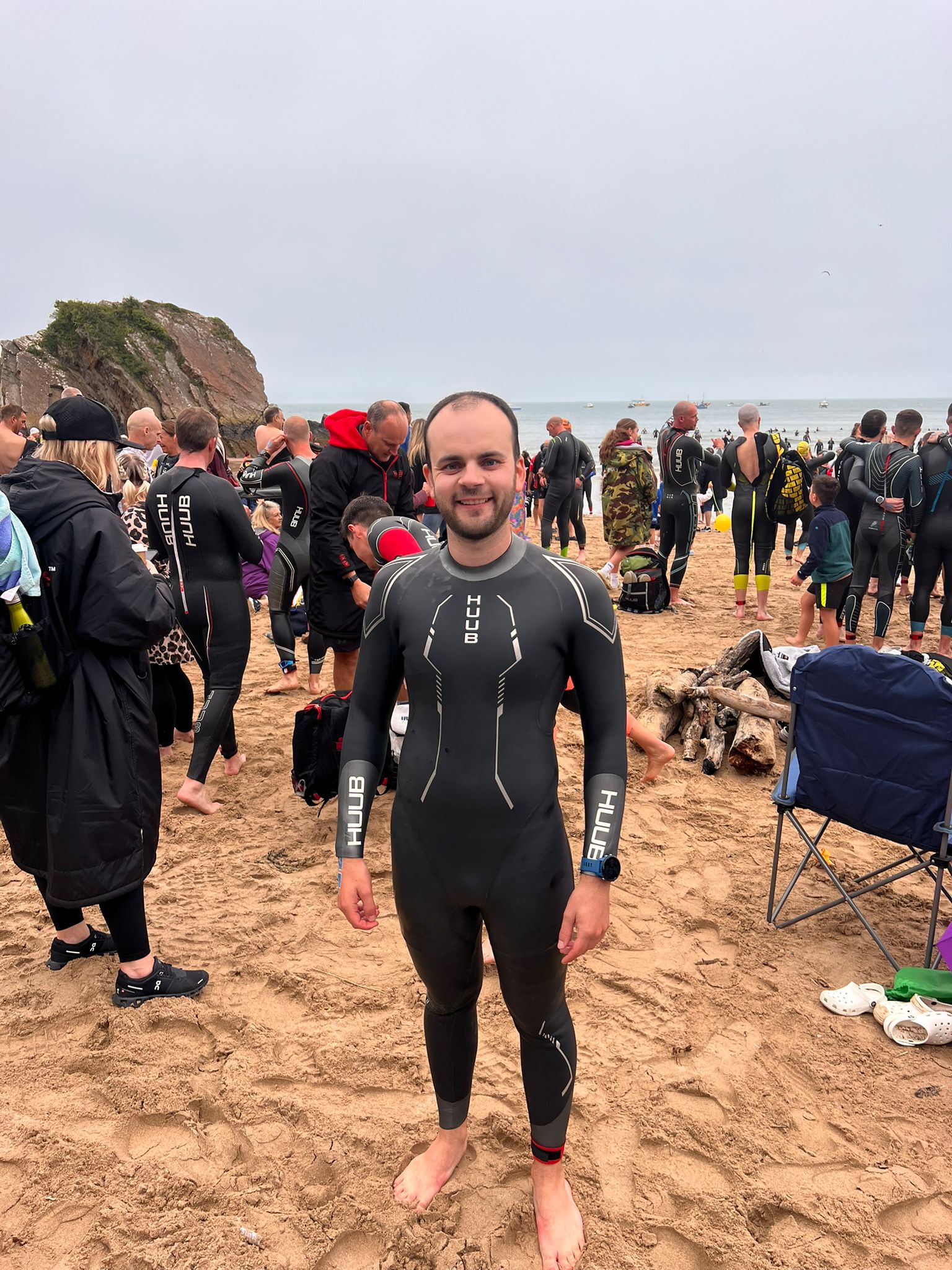 I got lucky and found Becca and Molly from TTG at the start line of the swim which helped with the nerves. I think I surprised myself with how well it went. The conditions were much more pleasant than at Blackpool Sands, and I managed to swim 99% of it in front crawl. Tenby’s north beach is shallow and well sheltered by the headland, and swimming bigger laps of 1900m makes it easier when you’re further away from the shore. The only challenge was sighting as there were no intermediate buoys, but overall it was a much, much more positive experience.